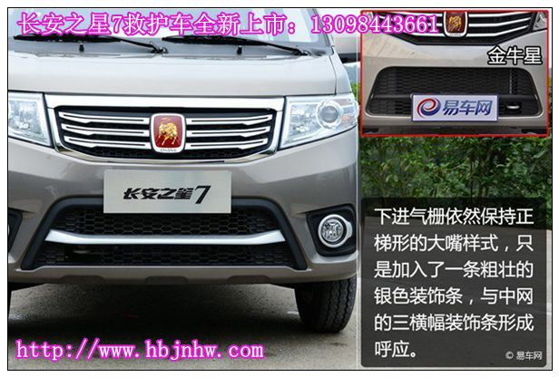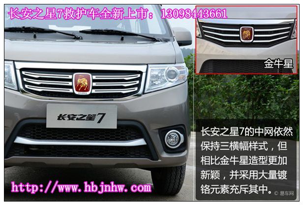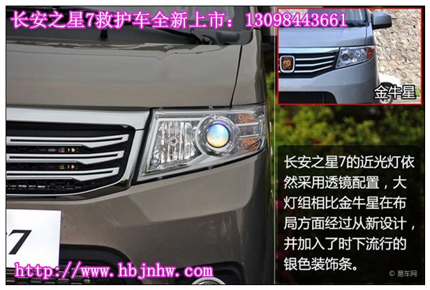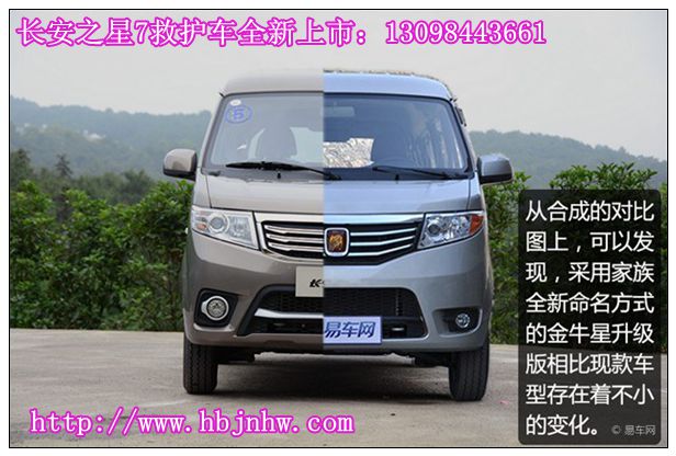 從下面的合成對(duì)比圖上,可以看出長(zhǎng)安之星7救護(hù)車與金牛星救護(hù)車在前臉上有很大的區(qū)別與變化,長(zhǎng)安之星7救護(hù)車前臉更時(shí)尚前衛(wèi)。