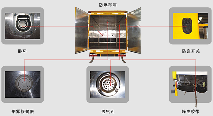 二、廂體結(jié)構(gòu):廂體為雙層金屬骨架結(jié)構(gòu),外部為冷扎鋼板,內(nèi)壁采用鋁合金板蒙面,夾層為隔熱阻燃材料填充。設(shè)置后對(duì)開(kāi)門(mén),開(kāi)啟角度270°,加裝側(cè)門(mén),側(cè)壁設(shè)有防雨功能自然通風(fēng)窗口,以使廂內(nèi)外空氣流動(dòng),廂體內(nèi)部做防靜電處理,廂體底部與廂內(nèi)前部鋪有阻燃導(dǎo)靜電膠板,并與底盤(pán)等電位連接,通過(guò)車(chē)輛后端的導(dǎo)靜電裝置與大地相連,可防止靜電火花的產(chǎn)生和車(chē)輛靜電及時(shí)釋放,提高車(chē)輛的安全性。廂體內(nèi)部前面和側(cè)面裝有固定拉環(huán),與捆綁帶使用捆綁貨物以避免移動(dòng),保證安全。