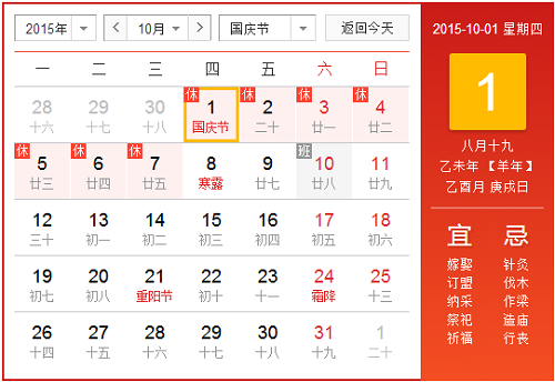 根據(jù)國(guó)務(wù)院辦公廳《關(guān)于2015年部分節(jié)假日安排的通知》精神,2015年國(guó)慶節(jié)放假安排時(shí)間為:10月1日至7日放假調(diào)休,共7天。10月10日(星期六)上班。