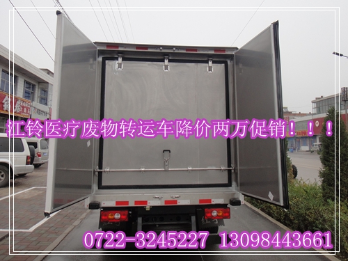 2、根據(jù)醫(yī)療垃圾的特點(diǎn)進(jìn)行針對性設(shè)計(jì),江鈴醫(yī)療廢物轉(zhuǎn)運(yùn)車采用密閉性運(yùn)輸,廂體頂部封閉,不可開啟;車廂左右兩側(cè)和后門為雙層密封結(jié)構(gòu),并采用迷宮式密封條,使車廂完全封閉,以達(dá)到防止醫(yī)療垃圾病菌毒氣的擴(kuò)散作用。側(cè)開門角度為180度,后開門開戶角度為270度,均安裝牢固可靠的門鎖。