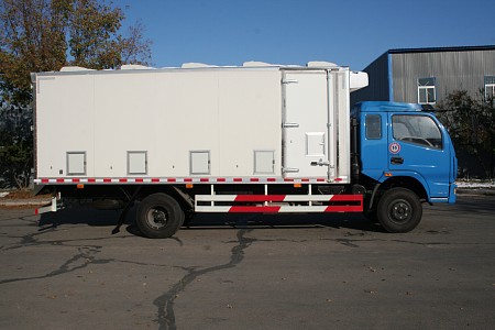 廂體前端上部選裝空調(diào)機(jī)組。頂部整體封閉不可開啟,頂部安裝有安全天窗和強(qiáng)制排風(fēng)電子風(fēng)扇。底板下部裝有燃油加熱器。廂體前端外部裝有進(jìn)風(fēng)道,后門裝有排風(fēng)扇,廂體兩側(cè)下部開有進(jìn)氣小窗口。廂內(nèi)為兩層結(jié)構(gòu)設(shè)計(jì),前端、兩側(cè)和地板裝有風(fēng)道。廂內(nèi)有溫度感應(yīng)裝置,在駕駛室內(nèi)可進(jìn)行溫度控制。 | ||