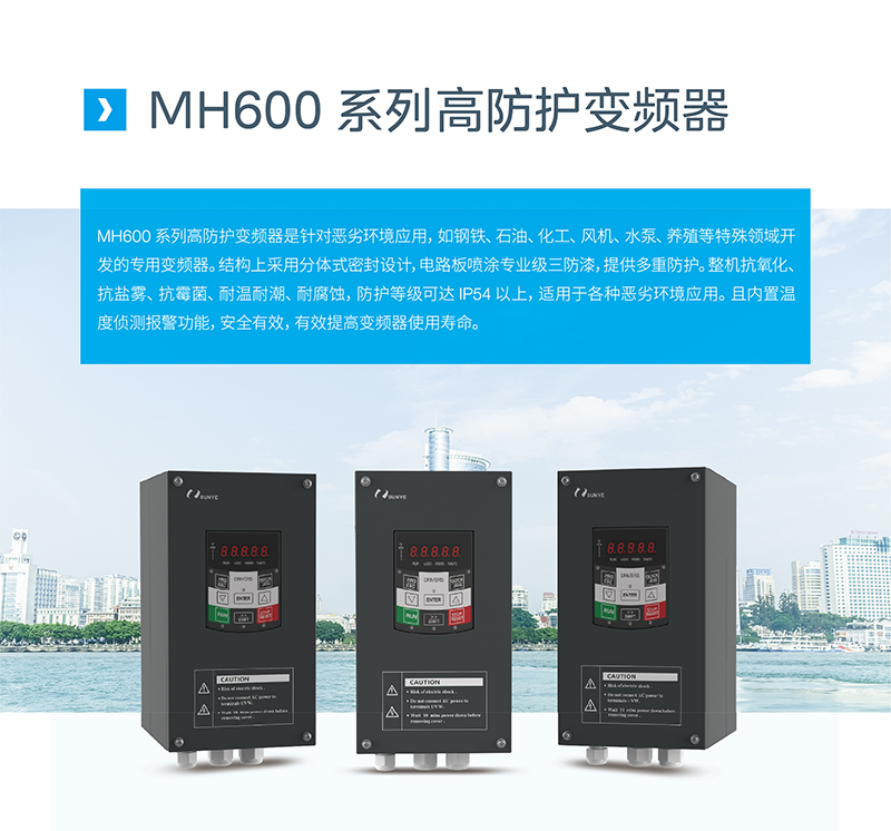 MH600 系列高防護(hù)變頻器是針對(duì)惡劣環(huán)境應(yīng)用,如鋼鐵、石油、化工、風(fēng)機(jī)、水泵、養(yǎng)殖等特殊領(lǐng)域開(kāi)發(fā)的專(zhuān)用變頻器。結(jié)構(gòu)上采用分體式密封設(shè)計(jì),電路板噴涂專(zhuān)業(yè)級(jí)三防漆,提供多重防護(hù)。整機(jī)抗氧化、抗鹽霧、抗霉菌、耐溫耐潮、耐腐蝕,防護(hù)等級(jí)可達(dá)IP54以上,適用于各種惡劣環(huán)境應(yīng)用。且內(nèi)置溫度偵測(cè)報(bào)警功能,安全有效,有效提高變頻器使用壽命。