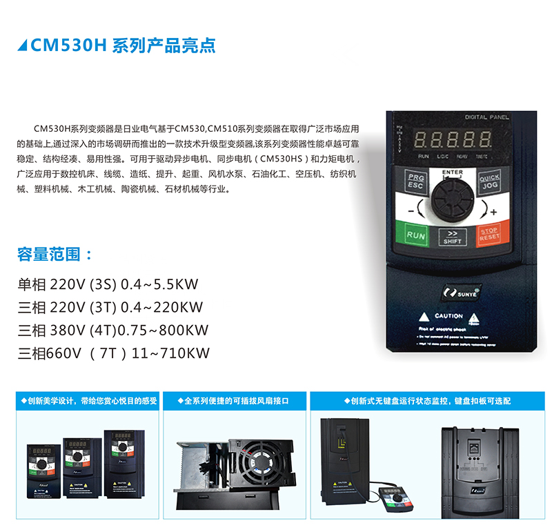 CM530H系列變頻器是日業(yè)電氣基于CM530,CM510系列變頻器在取得廣泛市場應(yīng)用的基礎(chǔ)上,通過深入的市場調(diào)研而推出的一款技術(shù)升級型變頻器,該系列變頻器性能卓越可靠穩(wěn)定、結(jié)構(gòu)經(jīng)湊、易用性強??捎糜隍?qū)動異步電機同步電機(CM530HS)和力矩電機,廣泛應(yīng)用于數(shù)控機床、線纜、造紙、提升、起重、風(fēng)機水泵、石油化工、空壓機、紡織機械、塑料機械、木工機械、陶瓷機械、石材機械等行業(yè)。