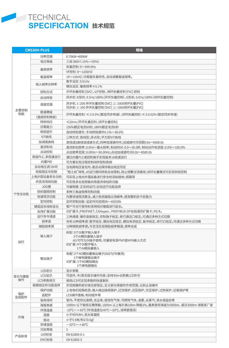 CM530H-PLUS系列變頻器是研發(fā)的新一代高性能矢量變頻器,采用國際領(lǐng)先的矢量控制算法,實(shí)現(xiàn)高性能、高精度的電機(jī)驅(qū)動控制,可廣泛應(yīng)用于異步電機(jī)/同步電機(jī)調(diào)速控制。支持主流總線通訊,如ModBUS、PROFINET、PROFIBUS-DP、CANopen等,為客戶提供可靠的解決方案。