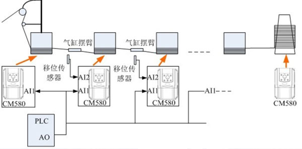 3、收卷。收卷部分是一臺獨立的收卷電機實現(xiàn),和拉伸電機之間通過張力擺桿PID調(diào)節(jié)實現(xiàn)線速度一致。經(jīng)過拉伸后的成品需要同步地纏繞在工字輪上,在整個工藝過程中,無論啟動加速、停機減速,任何線速度下的恒速運行均要求收卷電機和拉伸電機的運行轉(zhuǎn)速同步,否則就會出現(xiàn)絲線拉斷或者纏繞亂線等異常。在這個工藝環(huán)節(jié)里,要求收卷電機PID調(diào)速響應(yīng)快,速度控制精確。